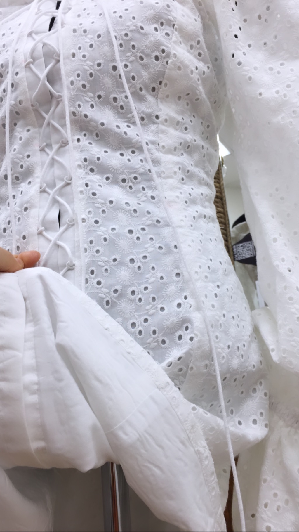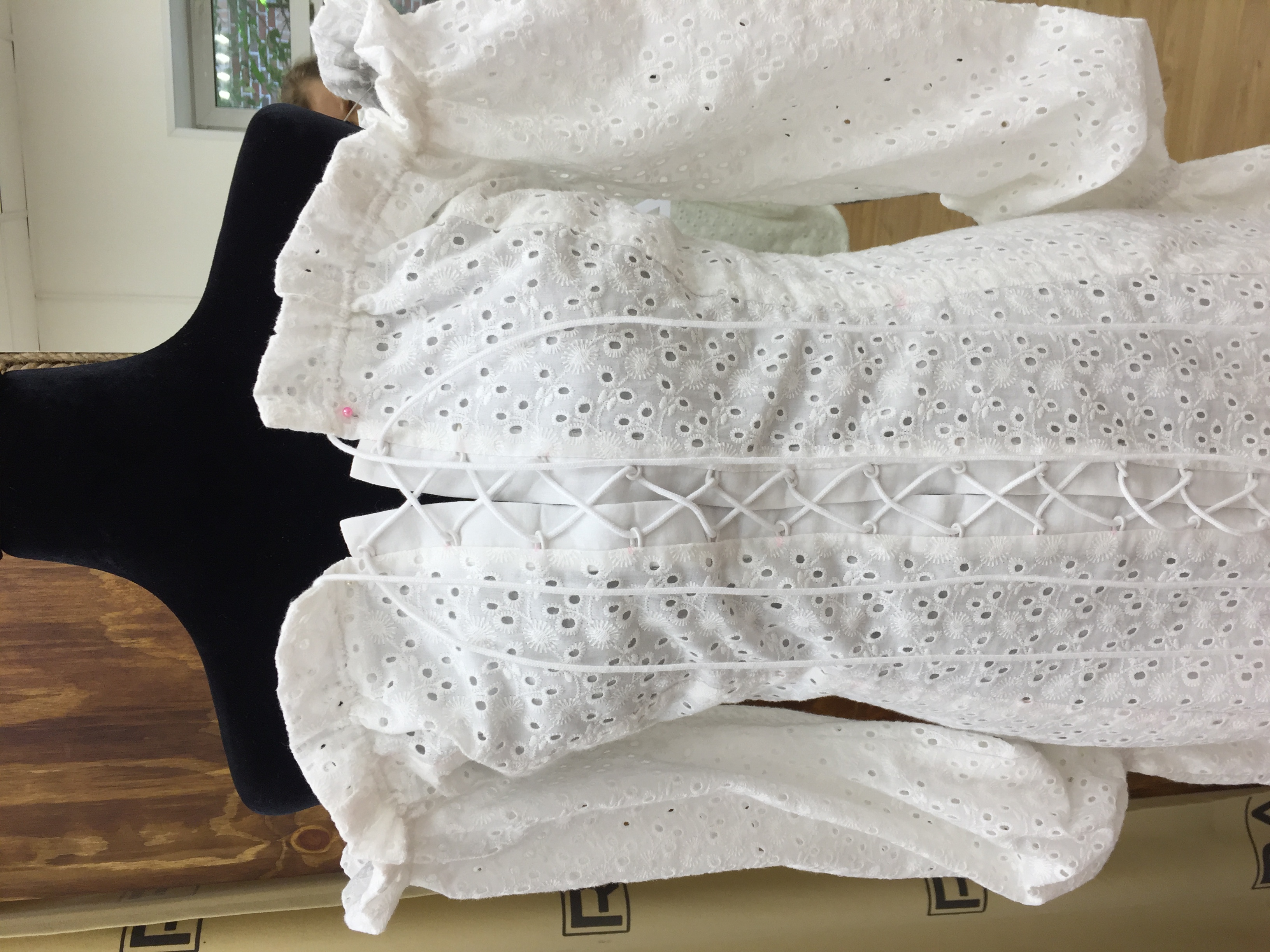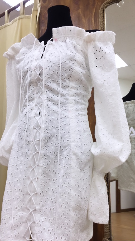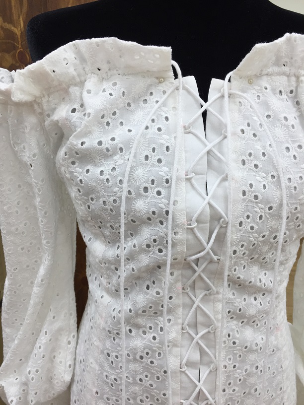 Летнее платье из белого шитья на батистовом подкладе. Открытая линия плеч делает образ очень женственным и привлекательным. Шнуровка позволяет сформировать объём платья по своему вкусу. Тонкий батистовый подклад приятен телу и не создаёт не нужного объёма.