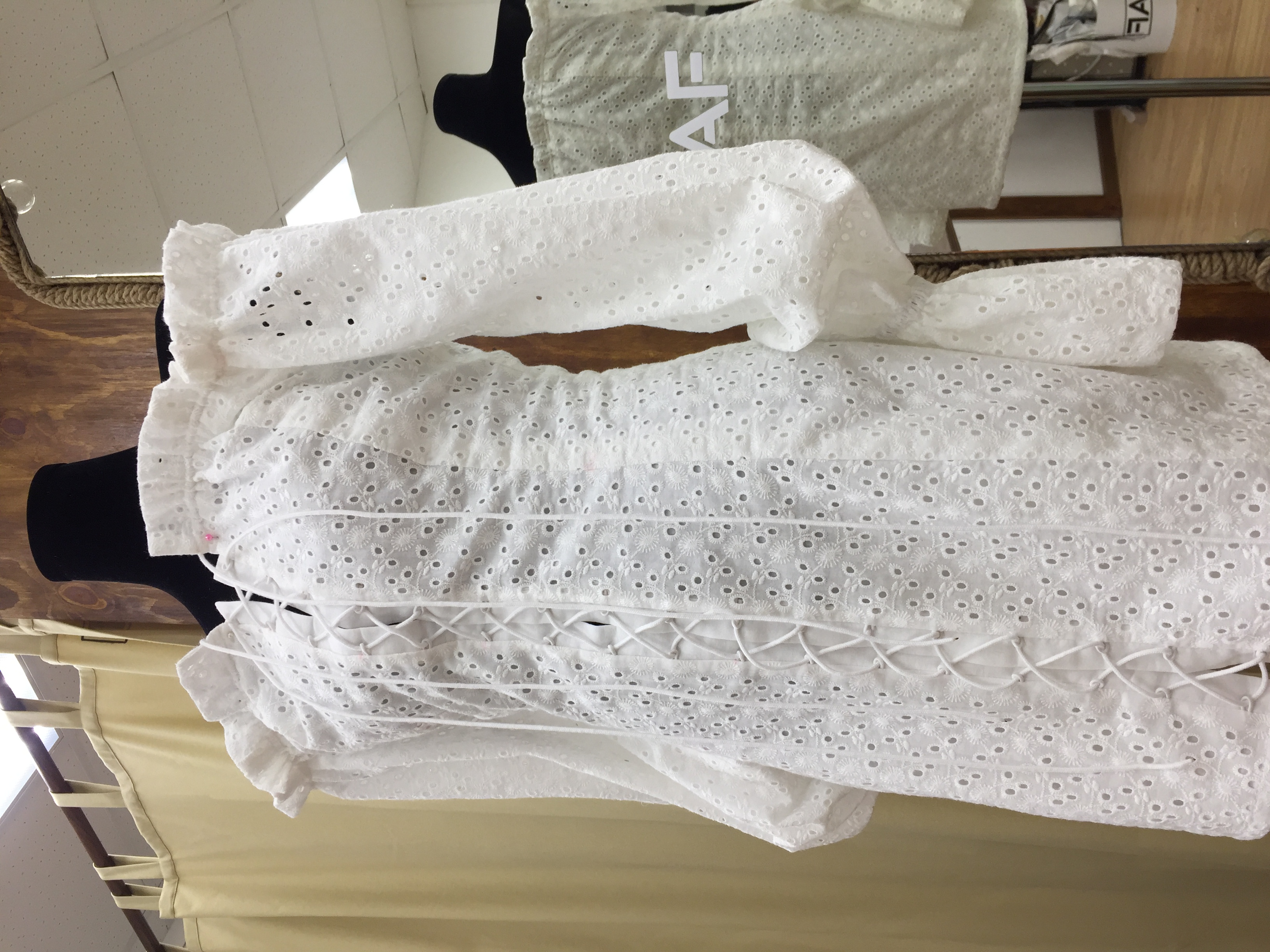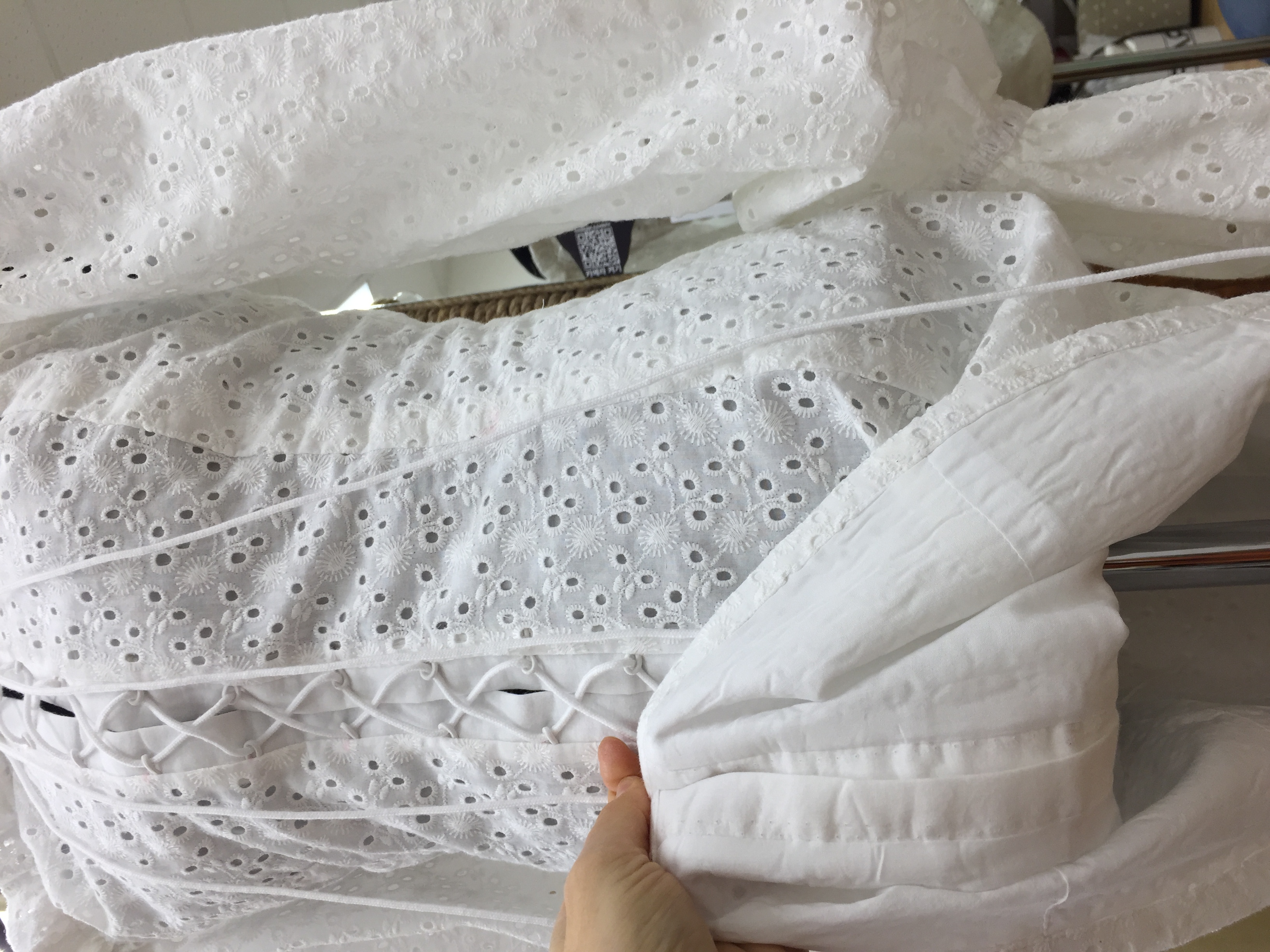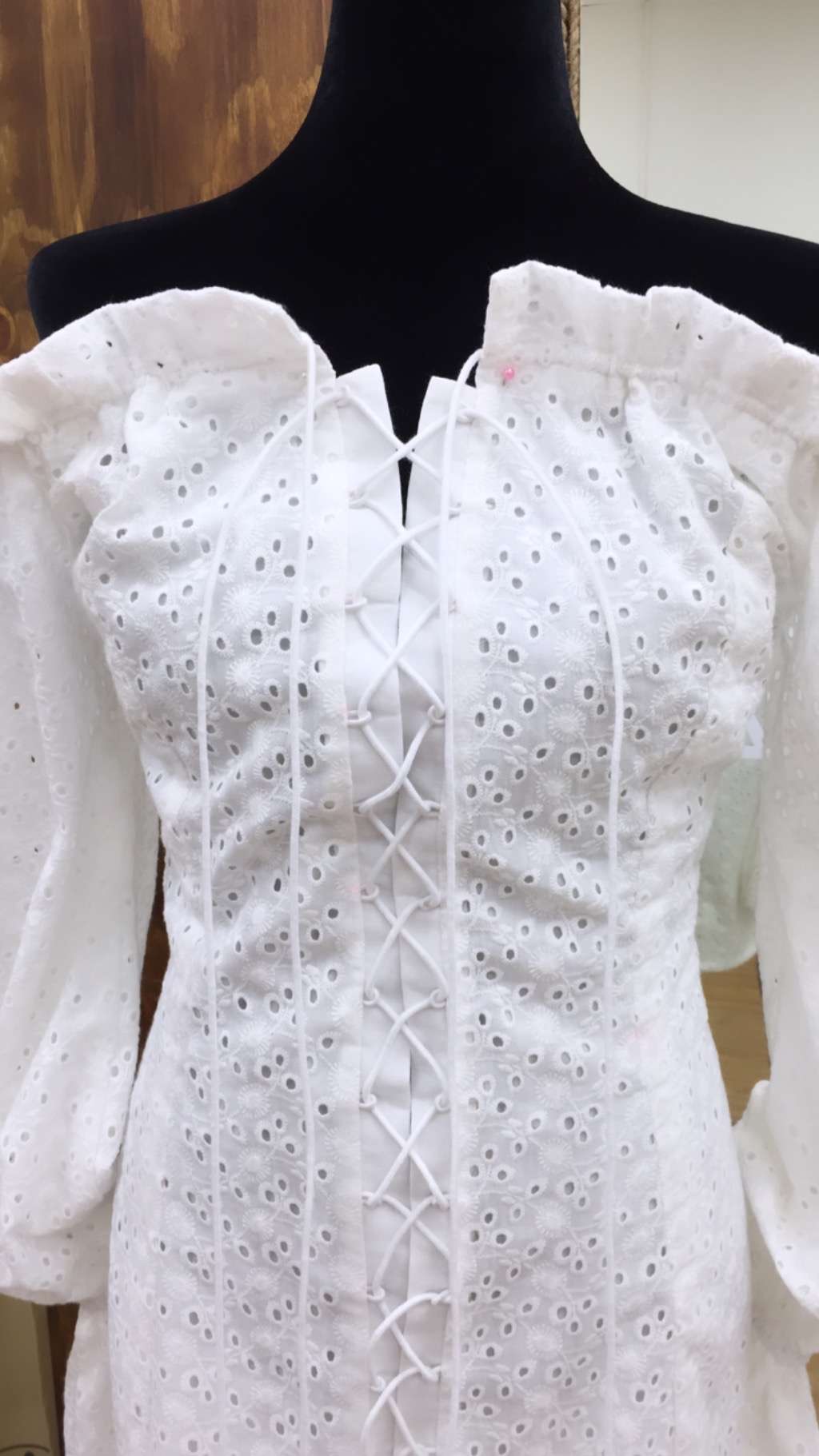 Летнее платье из белого шитья на батистовом подкладе. Открытая линия плеч делает образ очень женственным и привлекательным. Шнуровка позволяет сформировать объём платья по своему вкусу. Тонкий батистовый подклад приятен телу и не создаёт не нужного объёма.